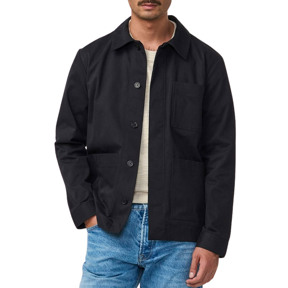 Workwear-inspired hybrid crafted in a structured fabric in Dobby weave, made from organic cotton with a touch of stretch. Designed with a soft collar, a single chest pocket, and twin patch pockets at the waist.